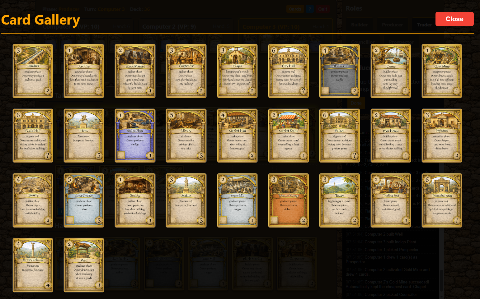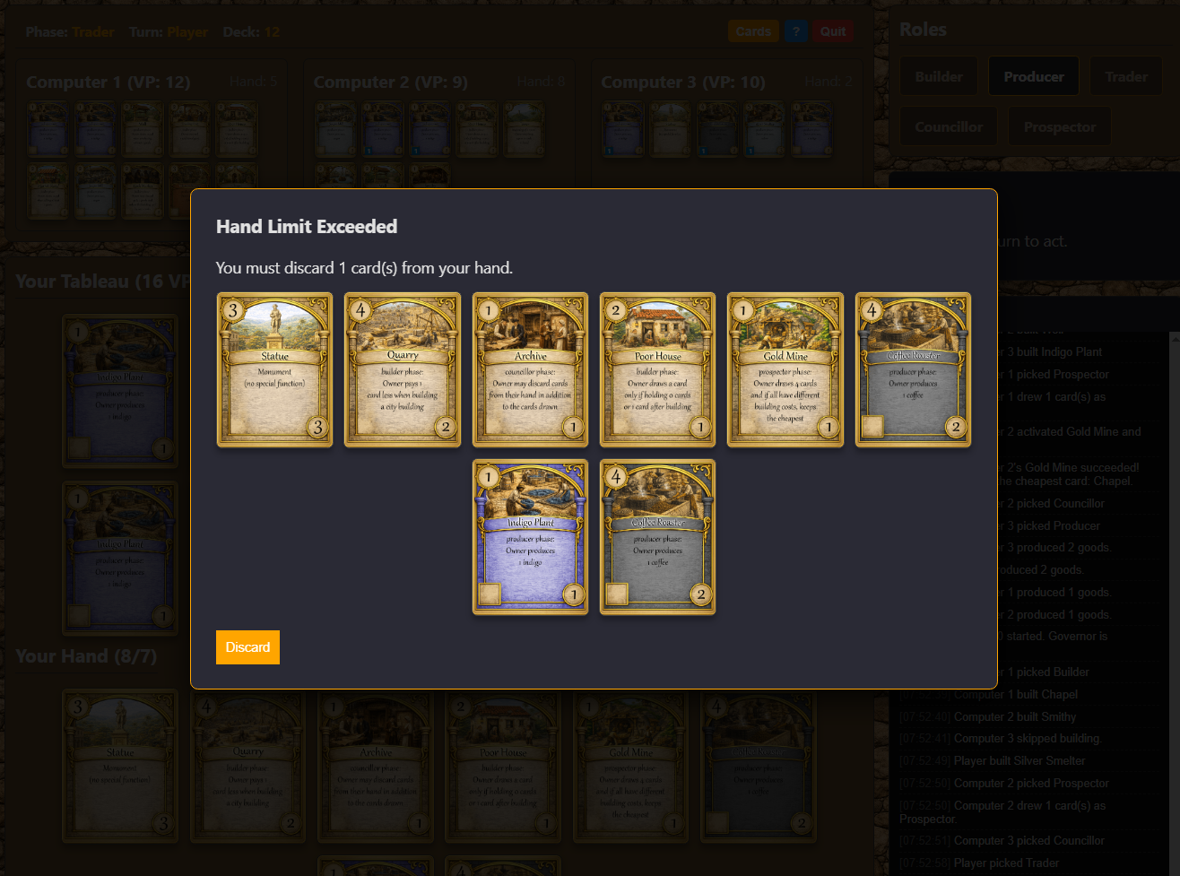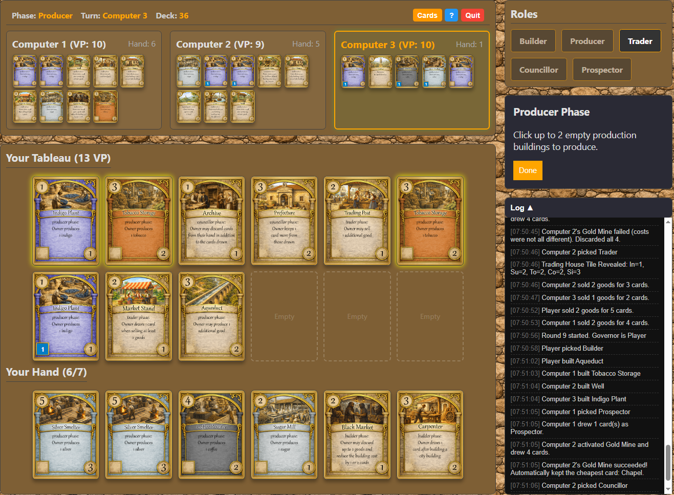 A digital recreation of the San Juan card game with computer opponents. Built using only regular vanilla javascript, html, and css, compiled with Electron to run on Windows computers. Fan made game.